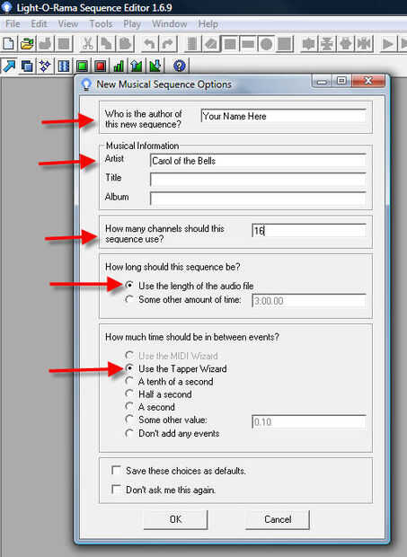 Para empezar, a File -> New -> secuencia Musical. Se deberá seleccionar el archivo de música de su elección. Después de hacer esto, llene toda la información correspondiente en la página de la nueva secuencia Musical. Asegúrese de que configurar el número de canales que la pantalla de iluminación. (16 para mí) También se puede jugar con estas opciones para optimizar tu programa. Elija cómo desea eventos para colocarse. Un evento es un punto en que algo sucede con las luces. Puede estar prendiendo las luces encendido o apagado, les descolorarse adentro o hacia afuera, o ajuste de brillo o centelleo. Eventos son los que hacen las luces de trabajo. Sus eventos pueden alinearse con el ritmo de la música, o con palabras o cualquier otra parte importante de una canción que le gustaría cambiar las luces.