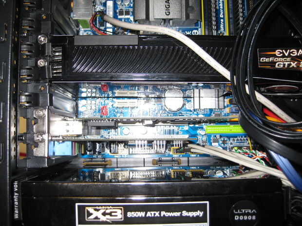 Después de que esté en su lugar y asegurada con tornillos en su lugar (una vez que sin herramientas no es suficiente), la tarjeta de red y tarjeta de audio para la computadora se conectan en las ranuras debajo de la tarjeta gráfica.