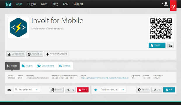 Después de la preparación de la parte de hardware y software es hora de hacerlo funcionar en el móvil. Porque Involt para móviles es Cordova/Phonegap en mi opinión personal lo más fácil es utilizarPhonegap Build que es herramienta de Adobe para el despliegue de aplicaciones móviles en el cloud. Con cuenta gratuita es posible cargar varios repositorio github público o archivo .zip solo.