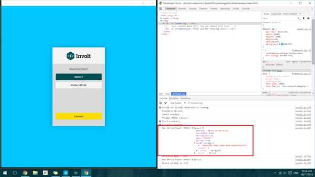 Abra la consola de Chrome para obtener la dirección (si no utilizas el modo AT) y el UUID. Para hacer esto - lanzar la aplicación, haga clic derecho sobre la ventana y haga clic en para examinar el elemento. Ahora debería ver (como en la imagen adjunta) la lista de dispositivos. La consola te da toda la información necesaria sobre los dispositivos.