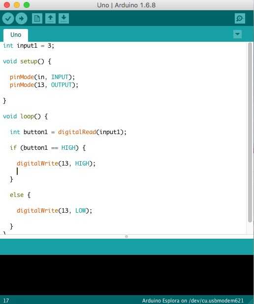 Lo que hace este código es comprobar una señal en el Pin 3. Si hay una señal, se encenderá el LED interno conectado al Pin 13 de la ONU. Sin embargo, para obtener una señal, deberemos conectar la Uno y Esplora juntos.