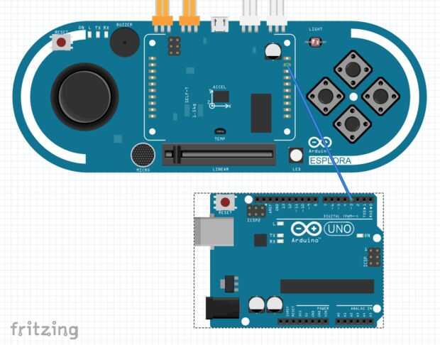 Ahora, para el paso más fácil de todo este proyecto, conectar clavija 3 en la ONU al pin 14 en Esplora tal como se muestra en la foto de arriba. Si hicieron todo correctamente, cuando usted presiona el botón inferior en el Esplora, el pequeño LED en la ONU se encender y apagar como usted pulse el botón!