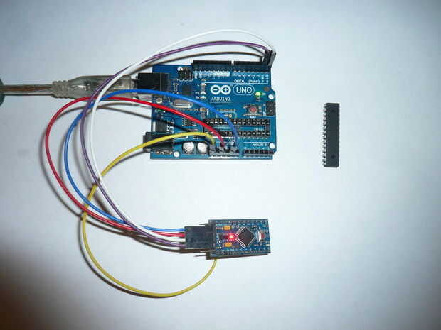 Retire Arduino UNO con Atmega328 Uso de macho a hembra cables conectan al MINI Pro a UNO RX RX; TX-TX; RST-RST; GND-GND; VCC + 5V Cambio de herramientas tablero de Arduino Pro o Pro MINI Añadir sketch