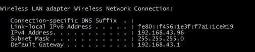 • mi IP de la máquina es 192.168.43.96 y mi IP de puerta de enlace móvil es 192.168.43.1 y que se muestra en la captura de pantalla anterior.