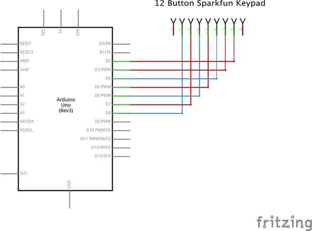 El cableado se realiza sin resistores externos, en su lugar utilicé el enderezamiento interno del microcontrolador (enderezamiento interno de Arduino tiene un valor de 20K ohms a 50K ohmios)