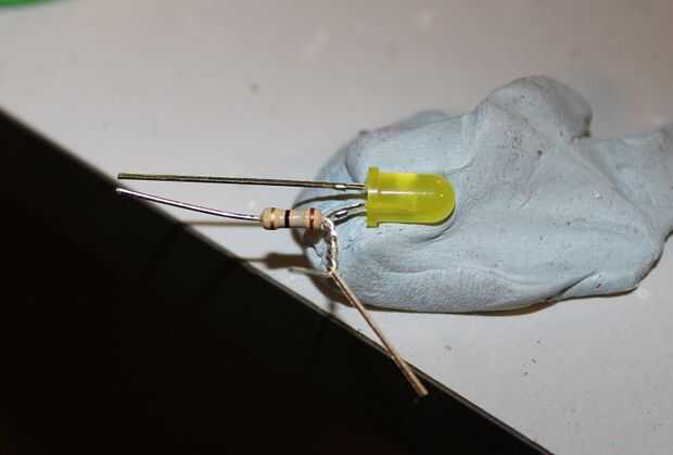 Soldar el LED y mantenerla compacta. El alambre - ve irá a la pata del LED al lado del borde plano. La + fuente ve irá a la pierna al lado el borde curvado. La resistencia aquí es ser soldada a la + ve la pierna.