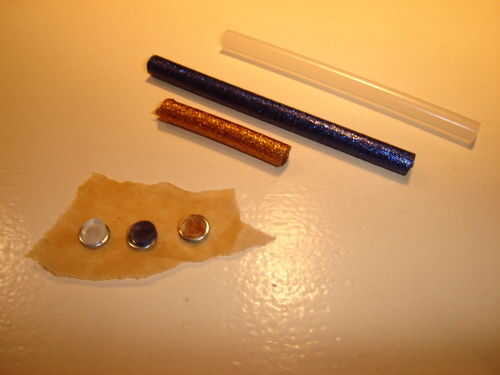 Ahora, parece bastante obvio usar 3 LEDs (intermitente), posiblemente activadas por algunos conmutadores reales. Pero recuerda que esto es un presupuesto bajo y ningún proyecto de soldadura. Manteniéndola bajo presupuesto dependerá mucho de lo que tienes a la mano. Esto es lo que hicimos: tomamos cinco anillos de metal de 10mm diámetro y cortar rodajas de unos 2-3mm de espesor de diámetro pequeño palillos del pegamento de hotmelt temp baja. Tres colores diferentes para las "luces" y transparente para los botones de dos. Los niños Coloque esto en algunos anti papel autoadhesivo un puesto en el horno a 150 grados de Celsius. El resultado puede ser pegado en lugar.