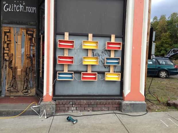 Recortamos dos agujeros de 1" de alambre en la parte posterior de cada caja, para que los cables podrían venir adentro y hacia fuera. Hemos comprado luces armario fluorescente simple, que podrían acoplarse juntos. Cada uno tenía su propio interruptor, por lo que miembros de la comunidad pueden cambiar en cada caja como que cayeron en su pensamiento/esperanza/sueño.