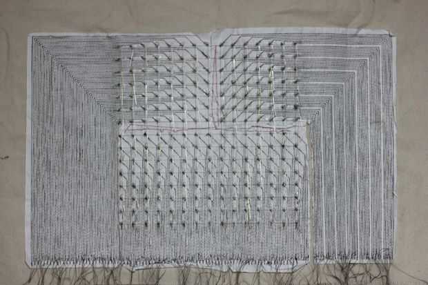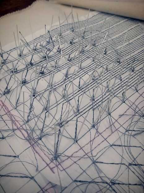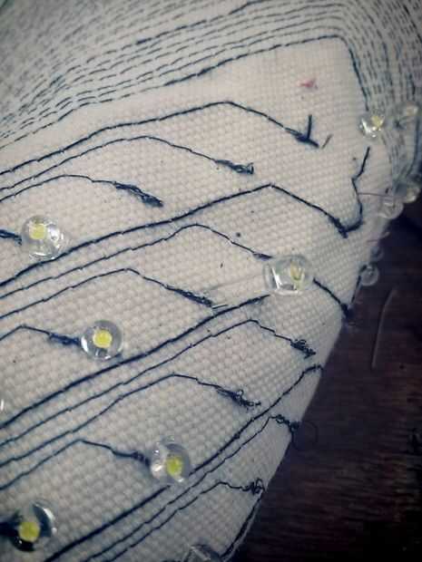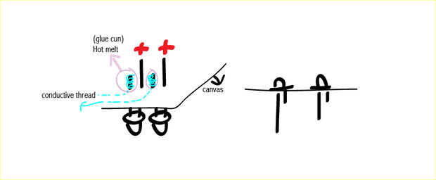 먼저 LED의 - 다리를 전도성실과 이어줍니다. 회로끝에는 약간의 실을 빼두 었으며 다리에 잘 감싸 이어줍니다.