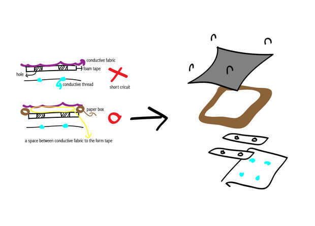 Durante este proceso, usé cajas de papel. Hice una forma de cajas de papel y luego fijar una tela conductora a un marco de papel. Usé la grapadora.