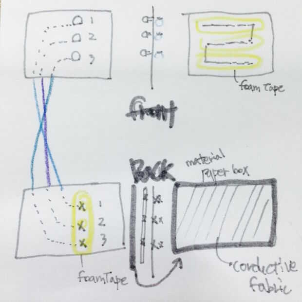 폼 위에 바로 전도성 천을 붙여 주면 작은 움직임에도 접촉이 되어 터치 하지 않아도 led가 켜지기 때문에 공간을 만들어 주어야 합니다.pic1
