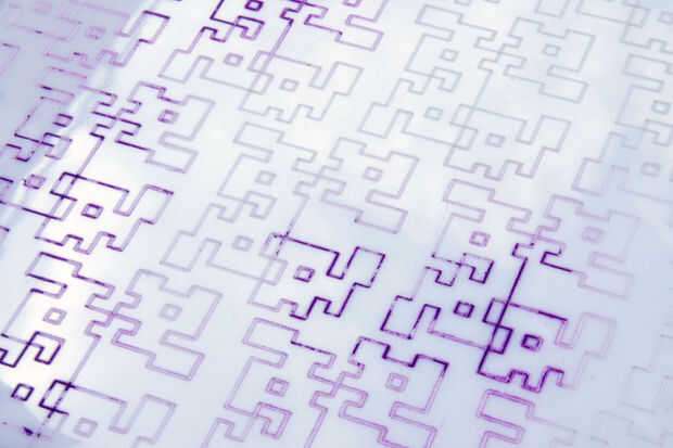 Nuestro primer experimento fue con ecoline (tinta). Como se puede ver en la primera imagen, la tinta de fusibles en las líneas de lasercutted y revelan el patrón. Pero por supuesto, lavando lejos fuera de las líneas de la tinta, la tinta fue arrastrada.