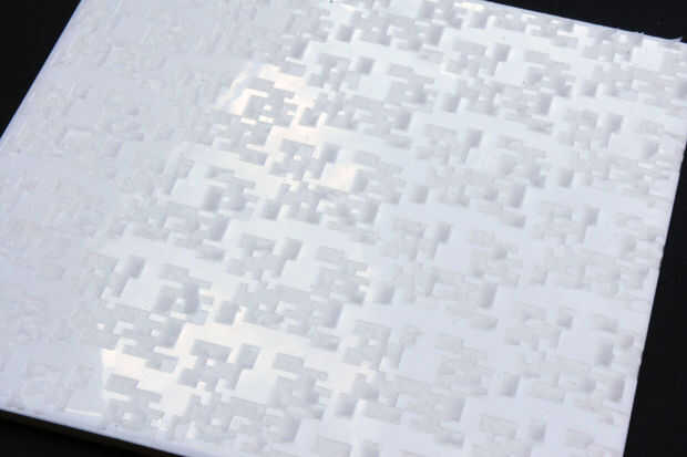 Esta imagen muestra el resultado de lasercutting el segundo patrón (ver paso 1) con una velocidad de 30%. Esto era un poco demasiado rápido y el efecto fue que el esmalte totalmente no estaba quemado lejos. Puedes ver una textura de hojas sueltas de esmalte. Creo que este tipo de 'fracasos' son hermosos y muy interesantes para nuestro proceso.