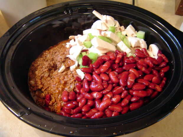 4. Agregue los frijoles, el apio y setas, revolver bien y cocinar durante 3-4 horas en alto o 6-9 horas en baja.