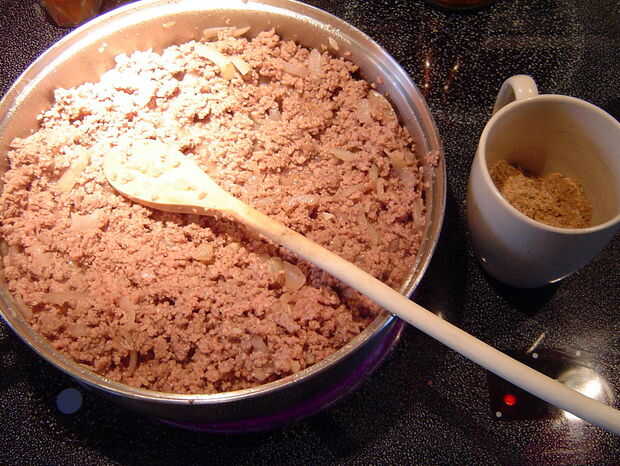 2. Ponga la pimienta de Cayena, comino, Chile en polvo, salvia, oreganum, sal y harina en una taza y mezclar bien. Agregar junto con la pasta de tomate y cocinar durante un par de minutos.