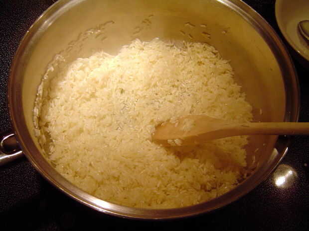 4. mezclar cuidadosamente, recuperar y cocinar otros 5 minutos, luego retirar del fuego y permita que el arroz al vapor durante 10 minutos.