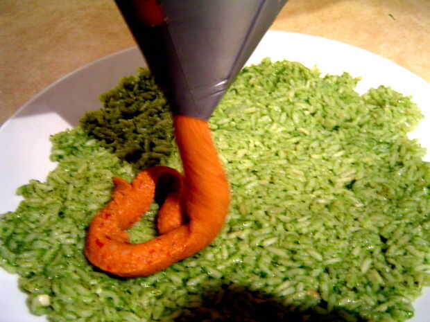 Conseguir una licuadora de palillo y mezcla el Chile hasta que los desaparezcan en su mayoría. Si es un poco líquida, usted necesitará agregar unas cuantas cucharadas de maizena mezclada con unas cucharadas de agua fría para espesar un poco. Una vez que la consistencia es perfecta, hacer un césped de arroz verde en cada plato. Obtener plano; Tome orgullo en su jardinería. Quizás extienda algunas rayas agradables ordenado los bordes y rastrille las hojas.