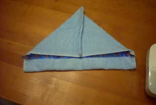Abierto hacia fuera toalla para formar un punto. Lado equivocado debe ser mirando hacia usted y la costura a que cosió va a correr por el medio.