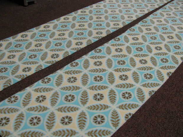 2 piezas de 12 "x 60" (o 1 pieza de 12 "x 120") de paño grueso y suave 2 piezas de 12 "x 9" de paño grueso y suave (para los bolsillos) Juego de hilo Máquina de coser Tijeras Pernos de Cinta de medición Algo circular con un radio de 9" para ayudar a cortar una esquina redondeada
