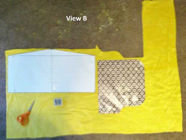 ¿Recordar en el paso 5, hablamos de siesta, la pila y la dirección? A la vista aquí, mi patron de cuerpo y capucha de manga está dispuesto tal que el terciopelo se siente más suave al pasar la mano hacia abajo, exactamente como yo lo hice con la tela minky. Ya que el elegido no duplicar piezas del patrón, voy a cortar cada pieza individualmente. Quiero mantener el patron tan juntos como sea posible, maximizando área remanente. Una vez que uso mis tijeras de tela para cortar de la primera manga cuerpo y campana, se vuelva a colocar los patrones de papel como se muestra en vista B. prestar atención a dos detalles: uno, el manguito se coloca para que la dirección de la nap es hacia abajo; y en segundo lugar, he hojeado la pieza campana así es la cara impresa en la parte superior (vista B). Esto es necesario para conseguir el espejo lateral de la campana con fuzzy lado hacia afuera.