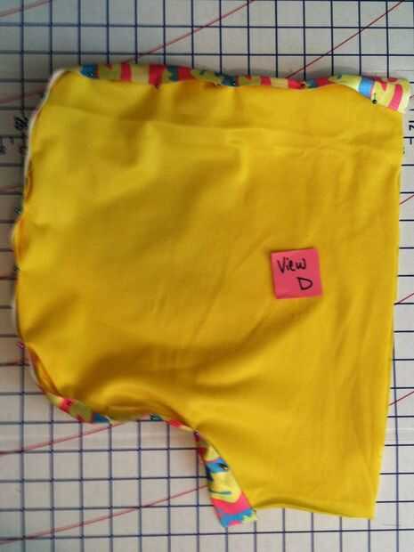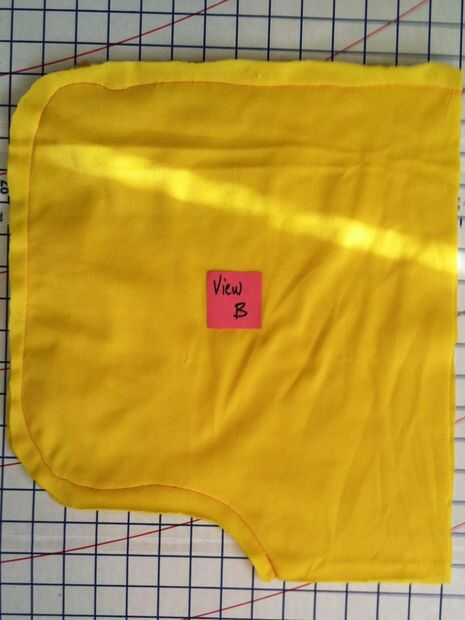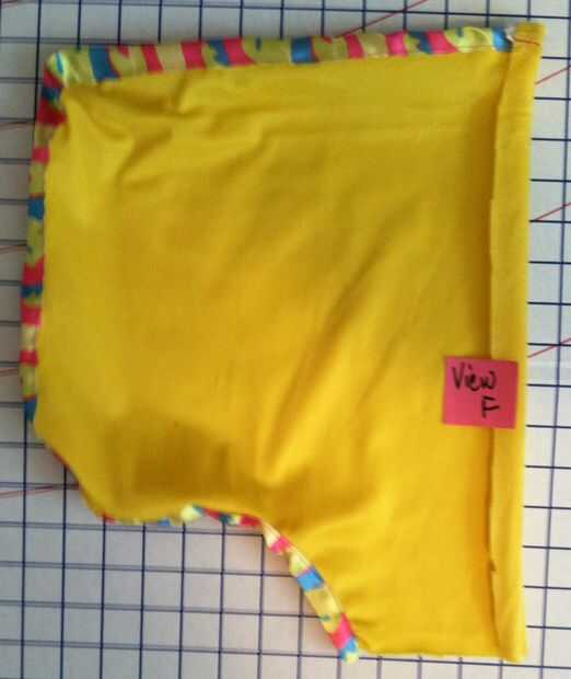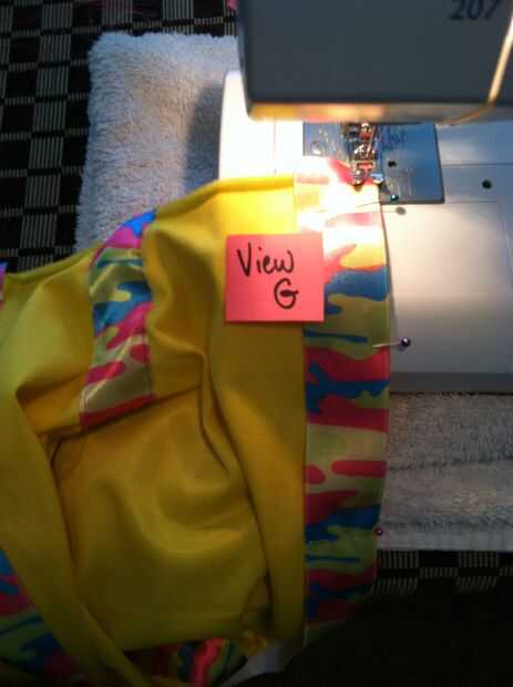 Doblar el borde delantero del capó más hacia el lado equivocado por 1/2"(ver F). Cinta del pasador al borde delantero del capó en el lado equivocado, cubriendo el borde de la tela. Coser la cinta a campana a lo largo de ambos bordes laterales, al igual que al cubrir la primera costura (ver G). Por último, coser-estancia 3/8" desde el borde exterior a lo largo del borde de unión de cuello (vista H).