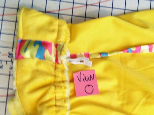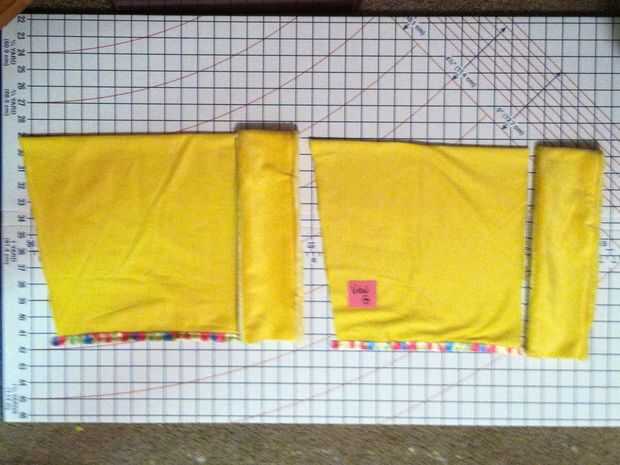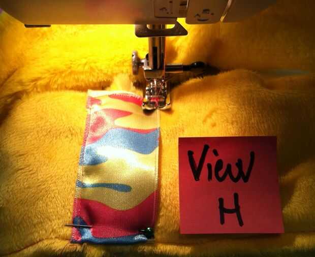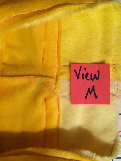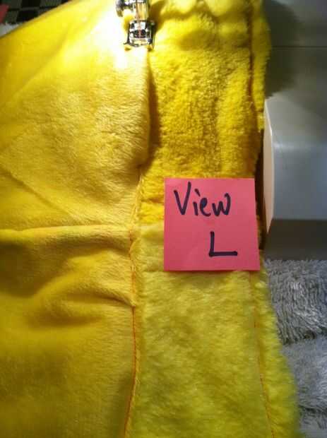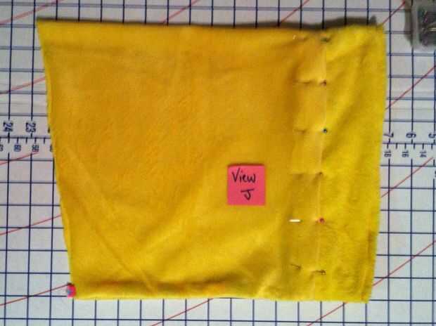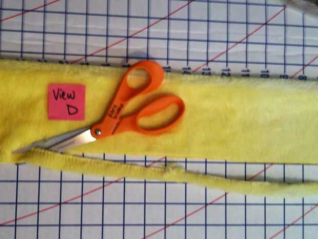 Recordarán que en mi caso, estoy usando una tira larga de tubo de minky por un lado y terciopelo en el otro para hacer mi manga campanas/volantes. Sólo sucede que uno de largo acabado fronteras del tiro. Lo que apesta es que la siesta del borde terminado en la dirección equivocada; Quiero abajo dirección como el resto de la chaqueta. Para evitar el uso excesivo desgaste de la cinta, decidí el dobladillo de puntada por primer corte el tubo a lo largo de la costura larga cruda (vista D), doblando los bordes en 1/2" y fijando les (ver E) y cose firmemente en su lugar (ver F).