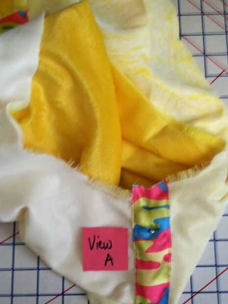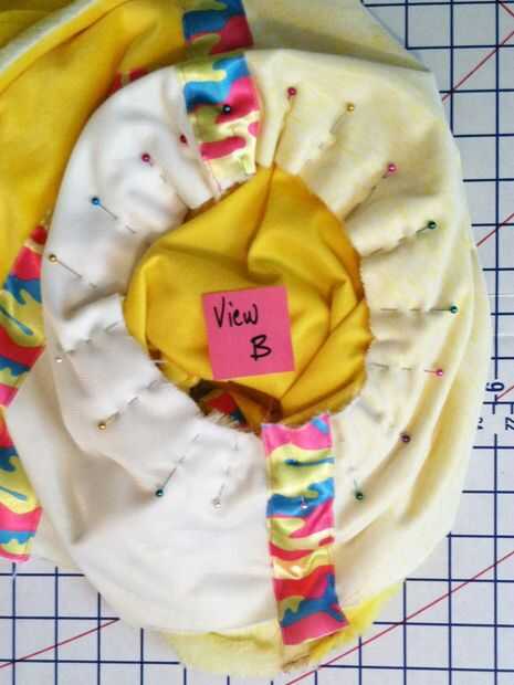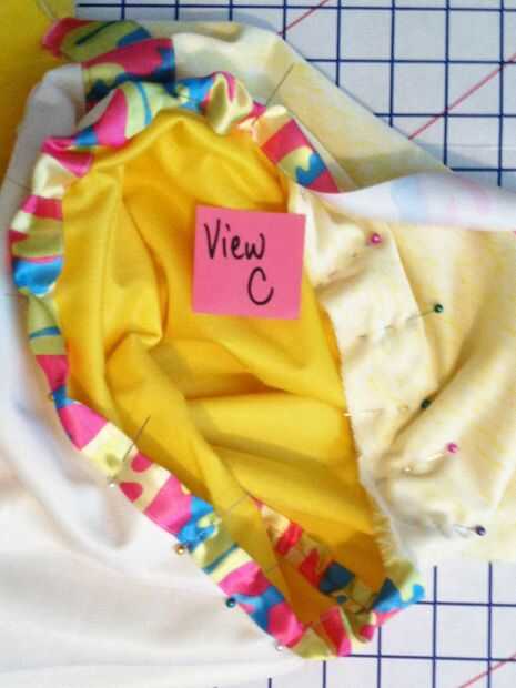 ¡Vale! Las mangas están montadas, por lo que la parte más difícil está hecha. Ahora a las mangas de la blusa. Empezar, alineando la costura debajo del brazo de la manga con la costura lateral de la blusa, derecho contra derecho juntos (ver A). Con cuidado prender la manga a la blusa, trabajando ambos lados de las axilas al hombro (vista B). Como todos los bordes crudos vamos a enlazar esto con la cinta también, pero crear la costura de unión al mismo tiempo. Corte una longitud de cinta la distancia de la sisa más 2". Doblar por la mitad, encajonar los bordes de la sisa y prender (vista C). Coser cuidadosamente la cinta, asegurándose de que a todos las capas de tela y cinta (ver D). Repita para la otra manga.