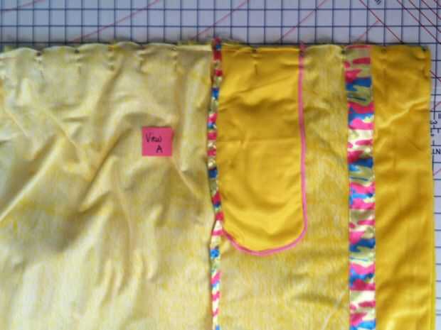 Tiempo para unir la chaqueta blusa y falda. En primer lugar, pin juntos las dos piezas a lo largo de la Unión (vista A). Coser cuidadosamente las piezas con un margen de costura de 1/2"(vista B). Abrir la costura plana y perno de la cinta a lo largo de la costura (vista C); coser la cinta hacia abajo a lo largo de sus bordes hasta el final.