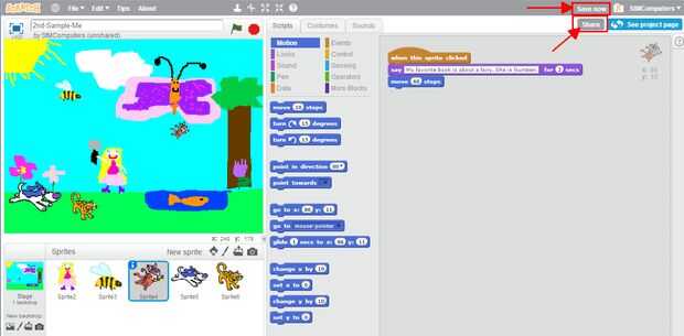En la imagen 2 se aprecia que una vez que ingresas, se dispone de opciones adicionales de Guardar ahora y compartir . Tengo estudiantes guardar y luego compartir. Entonces tienen los alumnos haga clic en el botón Ver página del proyecto .