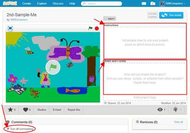 La imagen 3 muestra la página del proyecto. En algunos casos, mis estudiantes necesitan agregar instrucciones adicionales sobre cómo funciona su proyecto o deben agregar créditos de las imágenes utilizadas en esta página. Siempre tengo mis alumnos (si no la carga) Apague comentando sus proyectos. No han visto mucho spam o inadecuado comentar sobre el sitio web de Scratch, pero todavía esto apague en proyectos estudiantiles.