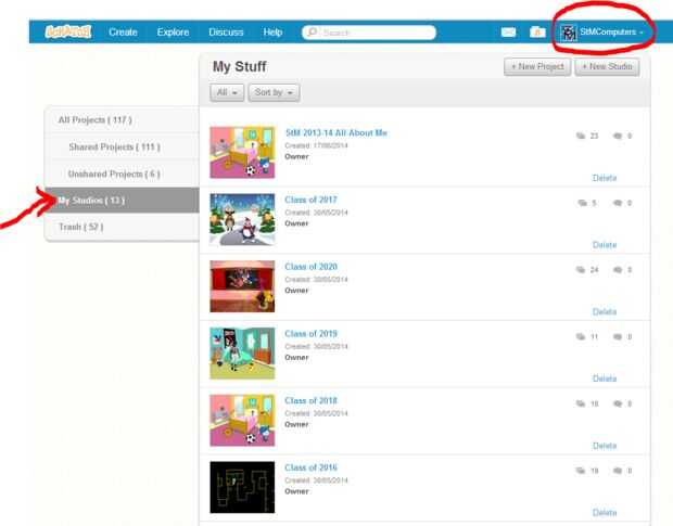 Como usted puede imagen tener una sola cuenta para el laboratorio de computadoras puede significar que hay un montón de proyectos para administrar. Trabajo en una escuela muy pequeña por lo que no es demasiado pero sigo sin utilizar estudios dentro de la cuenta de cero para organizar los proyectos subidos.