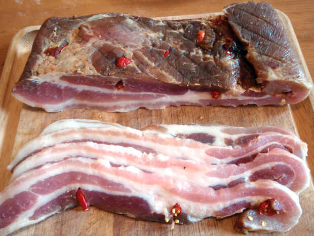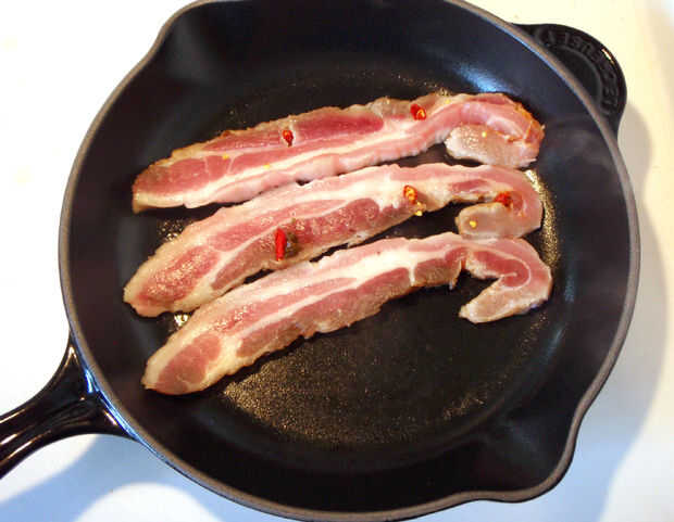 Tachonado de Chile Chipotle pimienta Bacon un tocino simple, casero encaja con los chiles ojo de pájaro tailandés y frota con el adobo y pimienta de smokey chipotle.