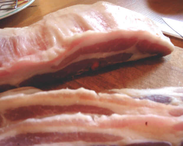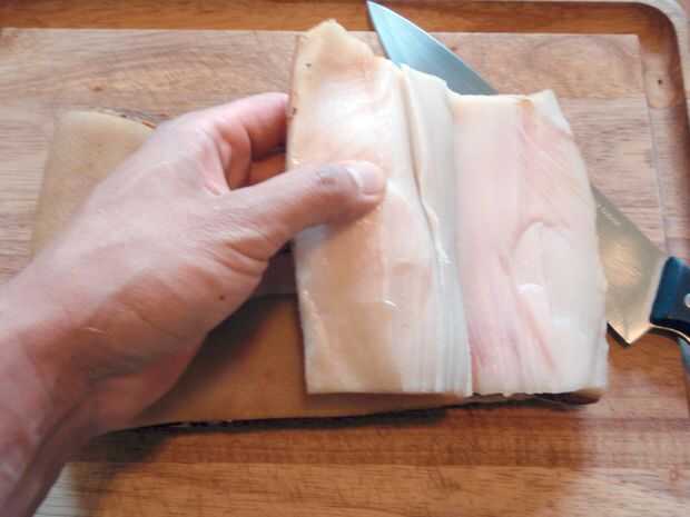 En primer lugar, tomar un afilado de cuchillo (tos * hint) y lentamente cortar la gruesa piel externa de la parte superior de la panceta.