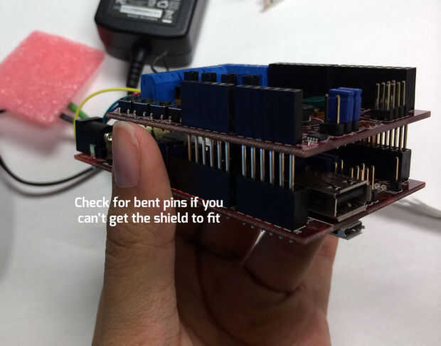 Enchufe suavemente la pletina de E/S en los pasadores de chipKIT, emparejar las patillas. Debe quedar muy natural. Usted no debe forzar el chipKIT para aceptar los pernos de la pletina de E/S. Si no siente que pueda deslizarse fácilmente en, compruebe para ver si todos los pernos estén alineados.
