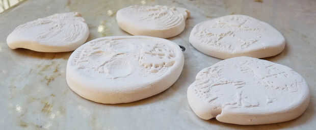 Hacer impresiones en la losa con sus sellos de goma. Deje suficiente espacio entre los estampados así que usted puede cortar alrededor de ellos. Si los sellos se pegan, usted puede espolvorearlos con talco.