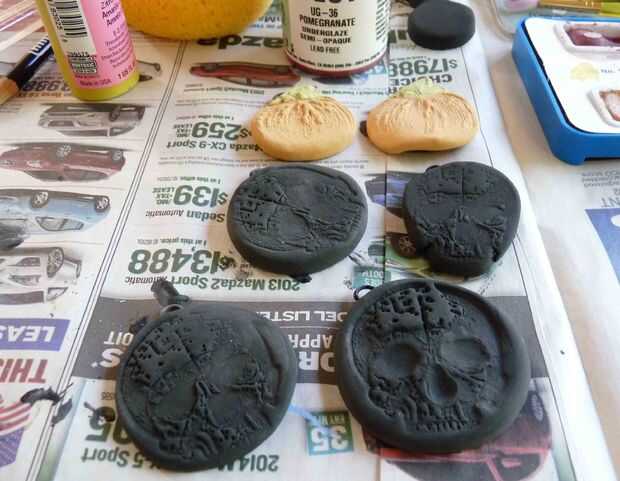 Si estás usando arcilla del polímero, pintar con acrílico. Colgante de pintura único en un momento. Pintar toda la pieza negra y limpie la superficie superior antes de que se seque. Utilice agua si es necesario. Dejan tanto color como usted tiene gusto. Cuando el acrílico esté completamente secado puede Agregar un brillo claro. Varias capas de trabajos de pulido de piso futuro gran!