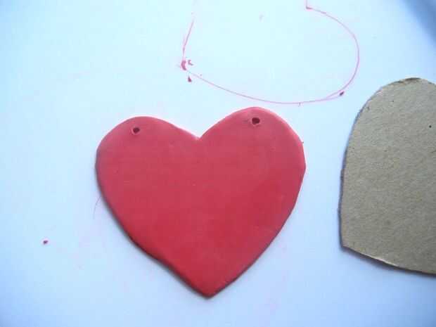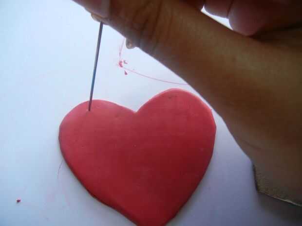 6. tomar un pincho de bambú y haga dos agujeros en la parte superior de cada curva en el corazón. [Asegúrese de que usted no demasiado cerca del borde].