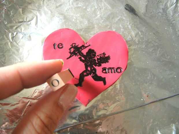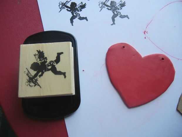 7. toma el sello y capa de tinta, sello en medio del corazón. Si usted tiene unos sellos de alfabeto agregar mensaje o escribe con pluma de gel, marcadores de prisma. Mina dice "Te Amo". [Nota: he utilizado inkpad archivo, asegúrese de que tinta usas porque ciertas tintas causará reacciones en arcilla con el tiempo de investigación.]