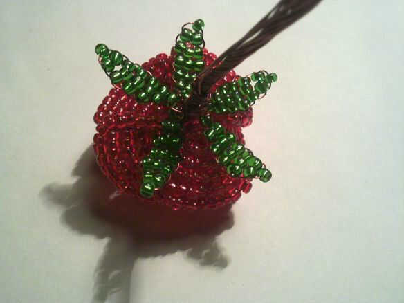 ¿Están todos los elementos listos? Entonces es hora de empezar a montar la rosa! Tomar una yema de flor, que debe ser colocada en el centro de la flor y colocar los 4 pétalos alrededor de él. Luego tome 4 pétalos más y colóquelos alrededor de la flor para que se vea hermosa. Por último, se deben adjuntar los sépalos y las hojas. Tomar el hilo mouline verde y pasarlo alrededor del tallo.