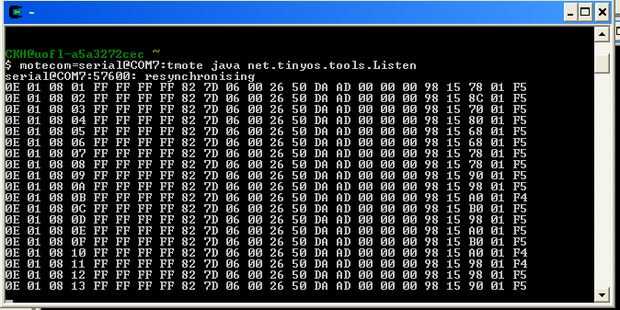 Sabemos que com puerto estamos conectados en el puede escribir en el siguiente, "motecom = net.tinyos.tools.Listen serial java" Esto le permitirá recibir información de todas las motas de polvo en el campo.