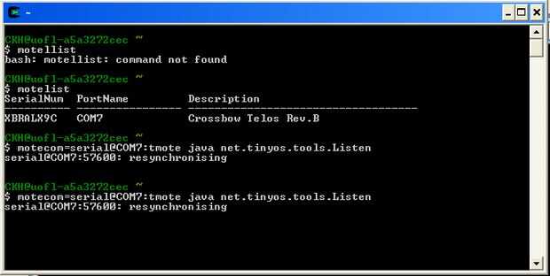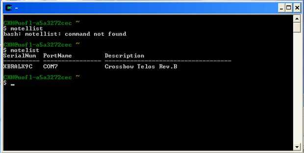 Para poder escuchar a motas de polvo que hay que tener uno de los motes de configuración con un programa de escuchado. Una vez que este enchufe en uno de los puertos usb. Ahora marcha de cygwin y escriba en "motelist", que esto le permitirá saber qué puerto com está enchufado el detector.