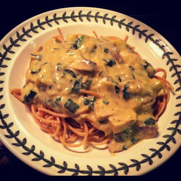 - Agregar contenedor de salsa de todo los alimentos veganos Alfredo y cocinar a fuego lento en baja durante 15-20 minutos de sabores se combinen.