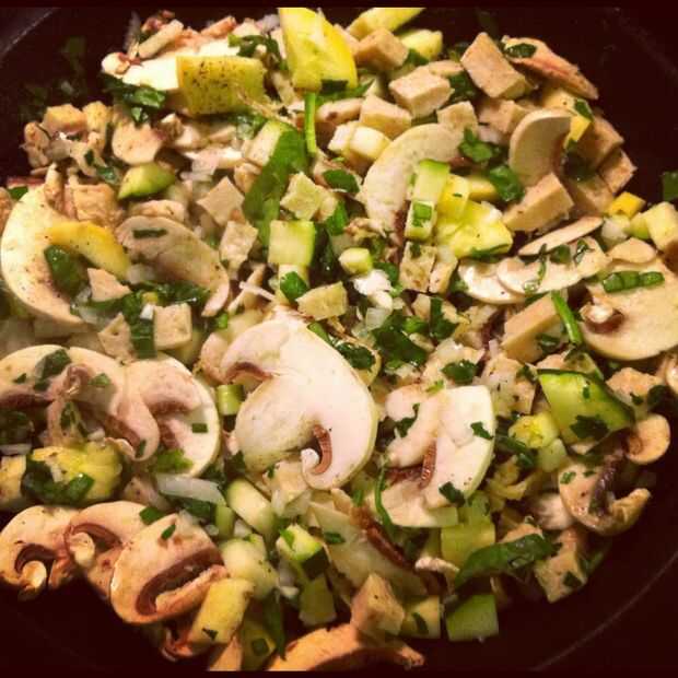 - En sartén antiadherente o experimentado pesado de hierro fundido cacerola, saltear verduras y milanesas de soja a fuego medio. (sugerencia-use un poco de agua, caldo de vegetales o jugo de limón para saltear en lugar de aceite)