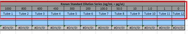 2. hoja en el Excel, inserte el valor de Fluorímetro para dilución estándar 1 (tubo 1) bajo la columna "0": célula (Figura 1). Este debe ser el valor más bajo de Fluorímetro.