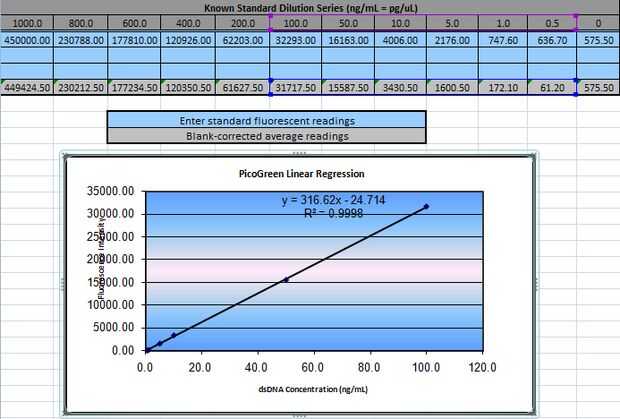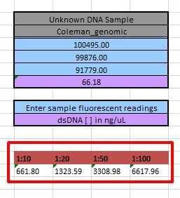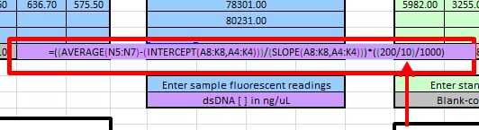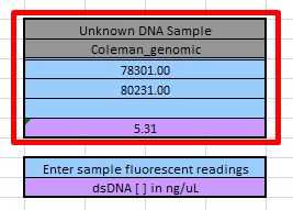 3 . Entrar en cada uno de los valores individuales que lees en las células azul primeras y segunda como se indica en la figura 3. El número en la celda morada indica la concentración de dsDNA en ng/ul, pero esto puede ser incorrecto.
