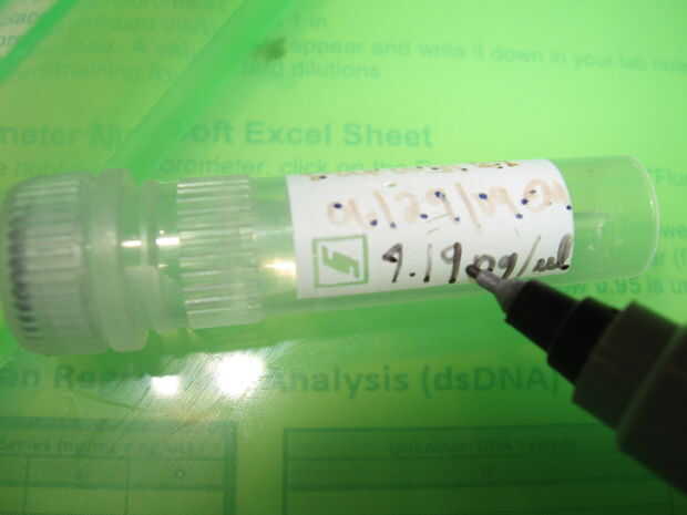 6 . Registrar las concentraciones de ADN en cada tubo de DNA con un marcador sharpie fino (Figura 3)
