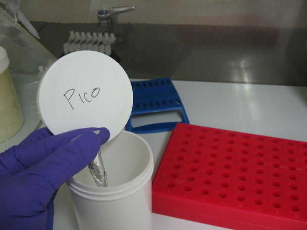 4. colocar los tubos del Picogreen en el recipiente etiquetado como "Pico" para protegerlos de la luz (Figura 1), o en el picorack en el cajón por el la campana molecular. Como se almacena en un lugar oscuro, va a estar bien.