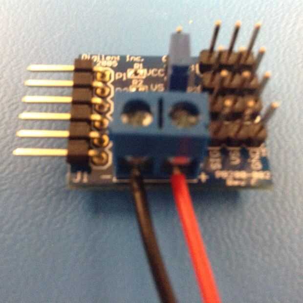 El PmodCON3 tiene un puerto terminal, esto significa que podemos poder la PmodCON3 y todos los servos conectados a la PmodCON3. Usted puede consultar el tercer cuadro para ver donde debe conectar los cables al chipKIT WF32.