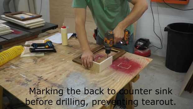 Primero hice un agujero poco profundo en la parte posterior del marco, esto evita rasgar hacia fuera cuando perfore el agujero a través y me da una referencia para avellanar. Había perforado el agujero avellanado del taladro pero fácilmente puede utilizar un taladro.
