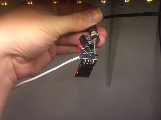 El condensador grande que ves es porque la potencia de mi fuente de alimentación es tipo de sucia por lo que apenas agarré el primer Cap que vi en mi escondite y soldadas entre GND y VCC para alisar hacia fuera un poco. (Si no esta seguro que tiene la polaridad de la tapa correcta)